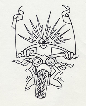 6: TRICKSTERS There was much frolicking and revelry and singing and dancing and consuming of fine spirits. Bang!opolis, in particular, had such a goodly share of beer and brandy that again he got inebriated and began throwing small thunderbolts, this time at poor little Kinkajou, who ran frightened and trembling back to the PerSisters, where for a time he huddled next to Wise Old for protection. ![]() Off work, Bang!opolis rides a Cosmic Harley. As the evening wore on, only Wise Old heard Kinkajou chittering repeatedly at Bang!opolis. Only W.O. saw Kinkajou begin to creep stealthily down the trunk of the ancient tree. Only the owl watched him dart furtively from bush to bush approaching the cosmic Harley. And Wise Old alone heard the hisssss as Kinkajou let all the air out of those two great tires. "Watch out; you did it now," said Wise Old when Kinkajou returned. "Bang!opolis will get you for sure." But Kinkajou was doubled over with silent laughter. Hours later Bang!opolis left the party, staggered towards his cosmic Harley, threw a wobbly leg over the seat, hit the cosmic starter, and roared away . . . for about ten yards. Shreds of tire flew into the air; the Harley ground to a halt. Bang!opolis stared in disbelief at the two ruint tires. And in despair he lay down under his spoilt bike, with the rain pouring down all around him. By and by Spanakopitus and Spanakopitae said goodnight to the rest of the revelers. Snug and smug in their Mercedes, they had driven only a short distance when they came upon Bang!opolis lying all soggy and muddy beneath his disabled vehicle. "Ah, we see you've fallen upon difficult times," they called to him out their car window. "Hop in, and we'll take you to dry quarters." Bang!opolis crawled into the back seat and huddled disconsolately, for it is hard for the mighty to take a fall. And carefully, so as not to jar their disgruntled passenger, the Spanakopiti drove home. It doesn't hurt to be gracious to the humbled, thought Spanakopitus. 7: The Turkey Shoot Caper Home |
